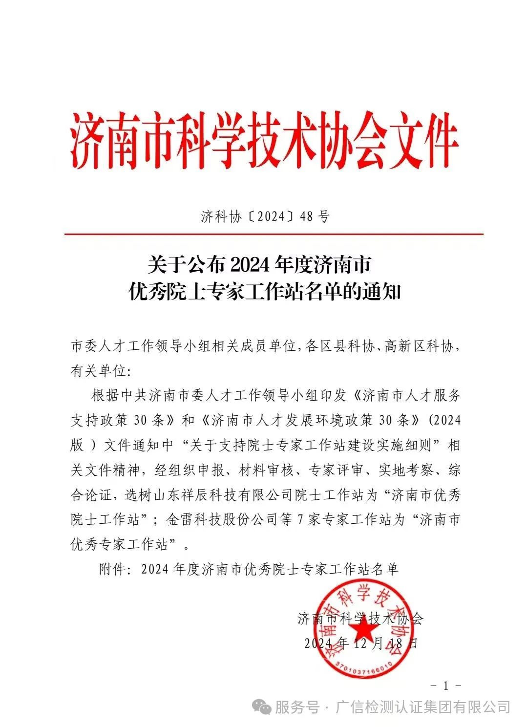 12月20日,济南市科学技术协会公布《关于公布2024年度济南市优秀院士专家工作站名单的通知》, 华体滚球被评为2024年度“济南市优秀专家工作站”。